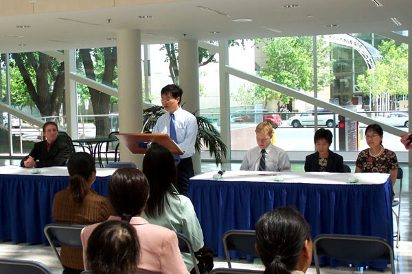 埃德蒙顿学员举行新闻发布会 揭露间谍迫害 图为新闻发布会现场