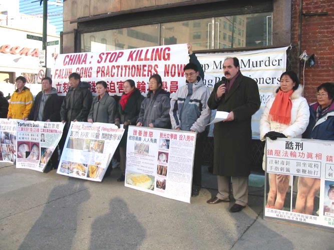 法轮功学员在芝加哥中领馆前举行新闻发布会,强烈谴责江泽民一伙残害法轮功学员的暴行 2002-01-11