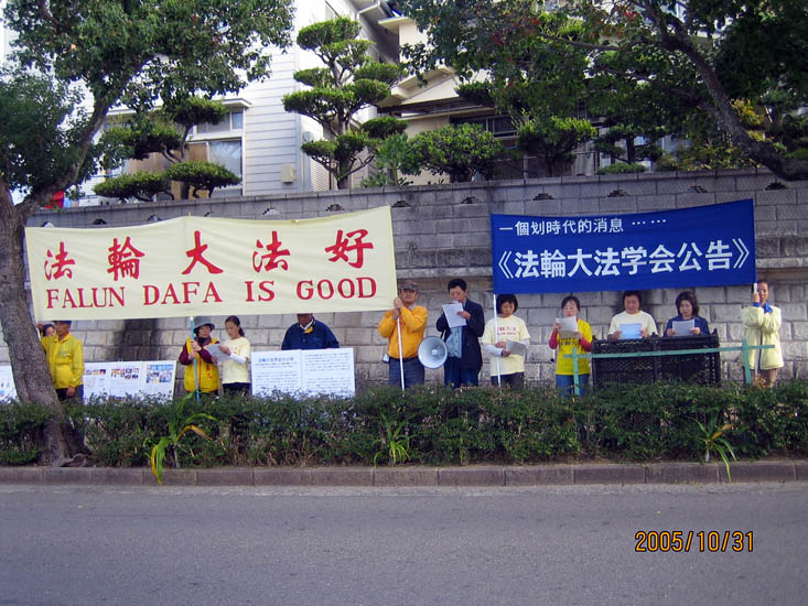 日本学员在驻长崎中领馆前宣读《法轮大法学会公告》,正告参与迫害法轮功的人悬崖勒马2005年10月31日