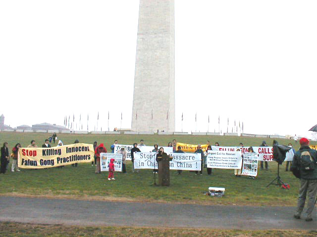 华盛顿DC法轮功学员在独立碑前举行新闻发布会和烛光守夜, 紧急援救长春的同修 2002-03-26