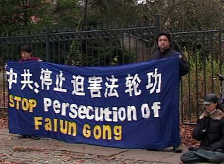 丹麦学员在中共使馆前宣读《法轮大法学会公告》, 吁中共官员弃恶从善 2005-11-23