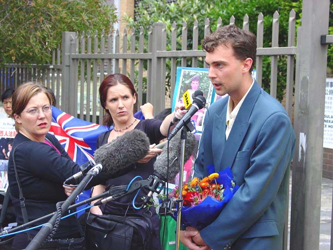 天安门和平请愿归来的悉尼法轮功学员大卫.鲁贝克,在悉尼中领馆前举行新闻发布会,讲述遭遇 2002-03-09