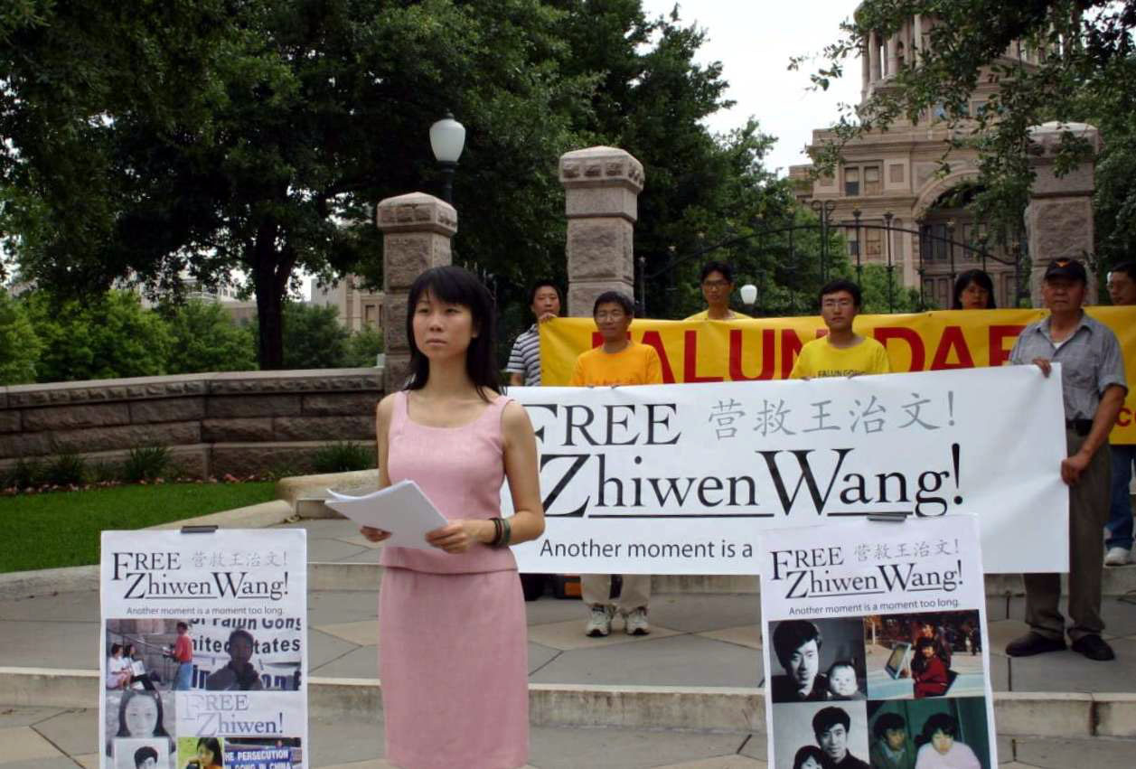 学员王晓丹在美国德州政府大楼前举行新闻发布会呼吁营救被中共非法判刑的父亲