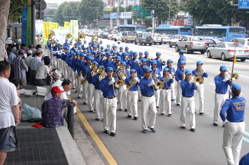 韩国学员在首尔宗庙公园集会,游行声援1200万人退出中共,图为韩国天国乐团2006-7-30