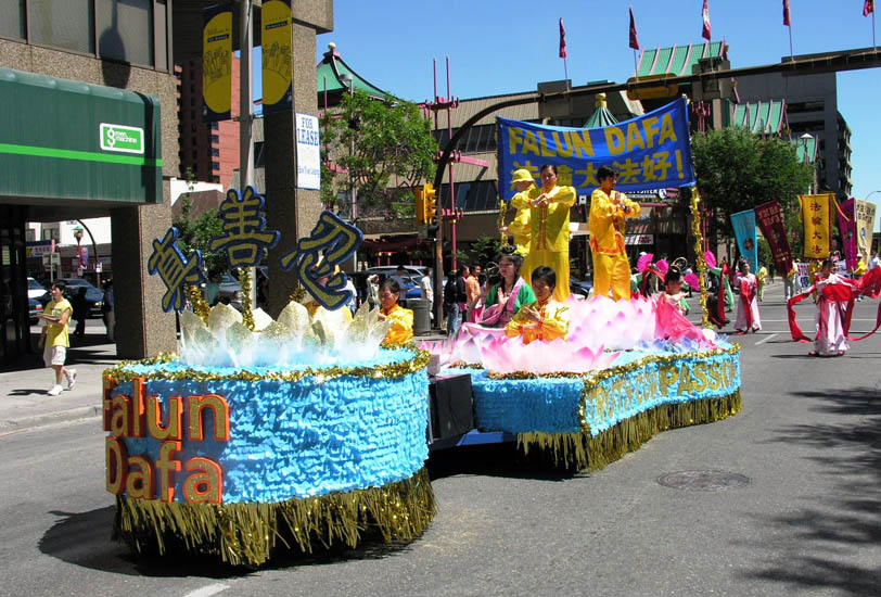 加拿大学员在卡尔加里中国城举行游行并通告调查团的调查报告,图为精心装饰的花车2006-7-8