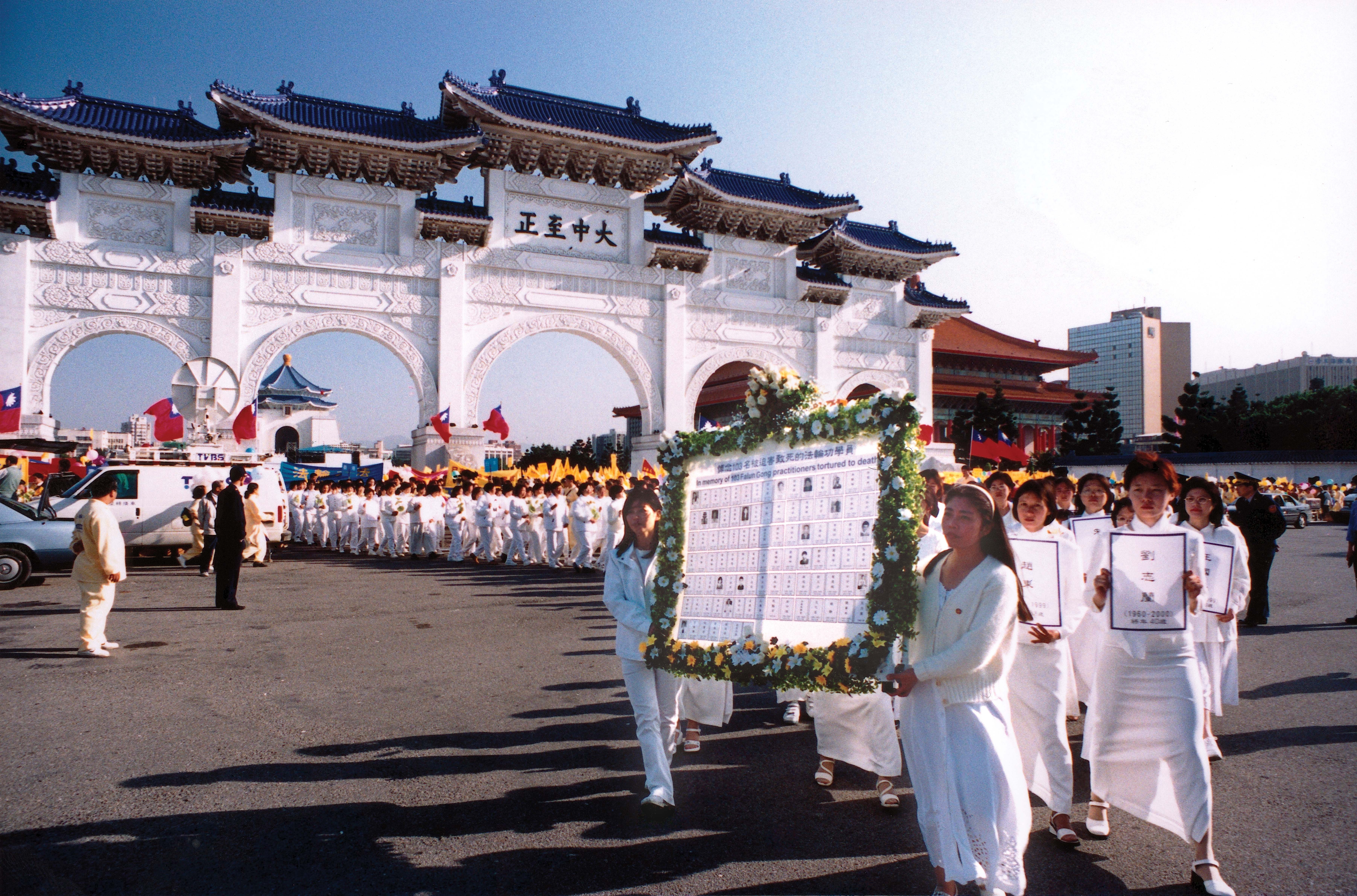 在台湾法轮大法修炼心得交流会期间,来自世界各地的约3000名法轮功学员在台北市游行,声援在中国大陆遭到迫害的同修.