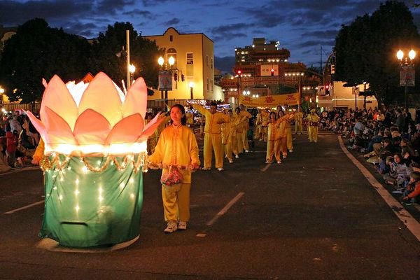 美国俄勒冈州法轮功学员参加了波特兰市庆祝玫瑰节的“星光游行” 图为莲花灯