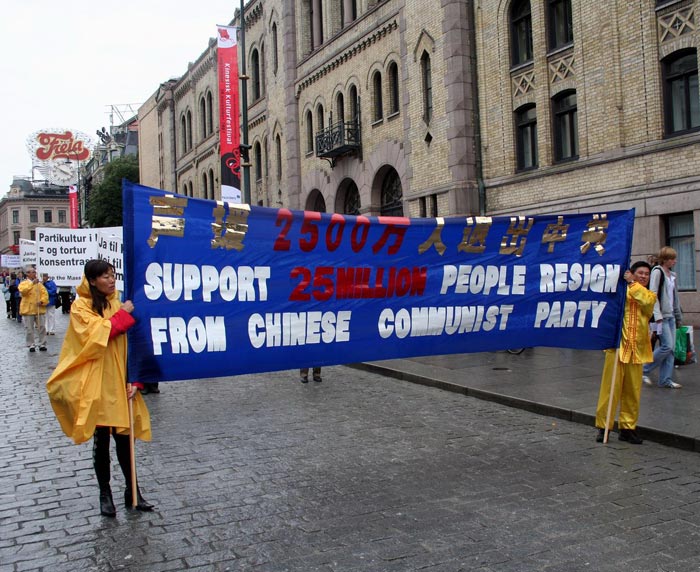 法轮功学员在挪威奥斯陆声援二千五百万退出中共的游行并传递中共残暴的恶行2007-9-1