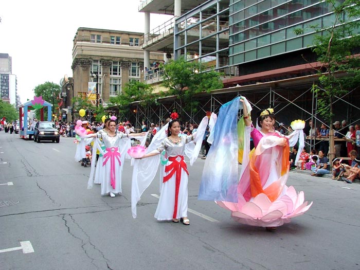 法轮功学员参加在蒙特利尔举行的加拿大国庆日庆祝游行,图为学员表演的莲花舞 加拿大 2004-7-1