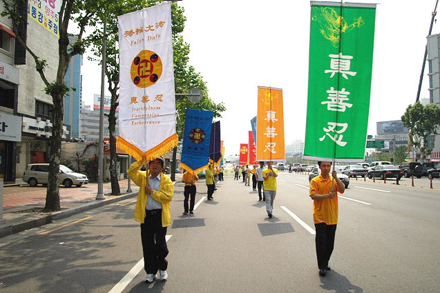 韩国法轮功学员在大邱游行和文艺表演庆祝世界法轮大法日暨大法洪传14周年。2006-5-21