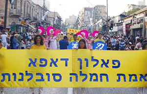 法轮功学员参加耶路撒冷节日大游行洪传大法的美好图为游行队伍经过人山人海街道2007-10-2