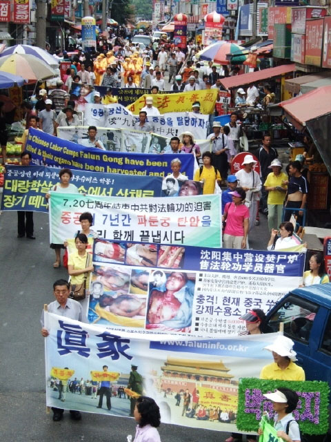 韩国法轮功学员举办活动游行谴责中共活摘器官的暴行,图为游行队伍穿过华人街2006-8-20