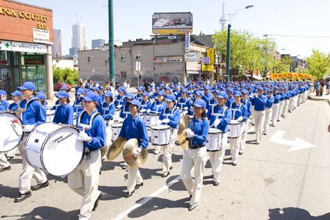 法轮功学员为纪念大法洪传十四周年在多伦多举行了盛大的游行2006-5-27 法轮功学员组成的天国乐队参加在波士顿的Dorchester Day游行.受到观众的瞻仰2006-6-4
