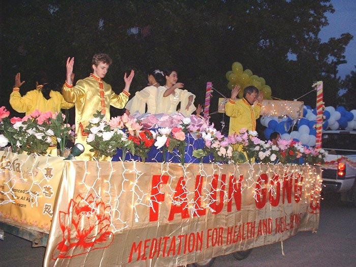 法轮功学员参加全美最大的校庆游行--宾州州立大学返校游行,图为学员在花车上演示功法 美国 2003-10-30