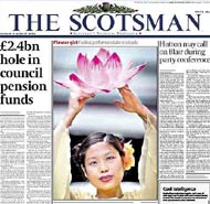 《苏格兰人》头版刊登的法轮功学员在爱丁堡国际艺术节团体游行中表演的莲花舞的大幅照片 英国 2003-8-3