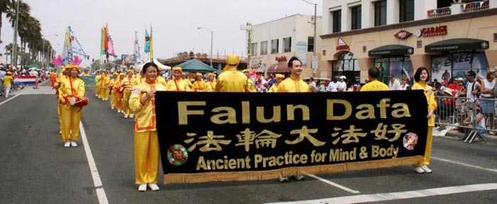 法轮功学员参加加州杭亭顿海美国独立日游行图为美好祥和的法轮功队伍2007-7-4