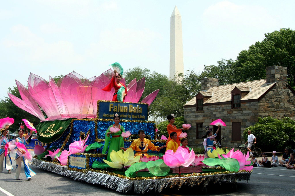 法轮功学员参加美国首都独立日庆祝游行,图为法轮大法精美的花车2006-7-4