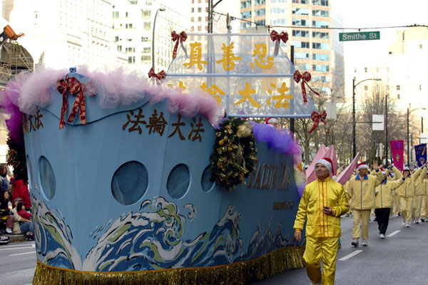 法轮功学员参加温哥华圣诞大游行图为长达四十英尺的“法船”型多姿多彩的花车2006-11-19
