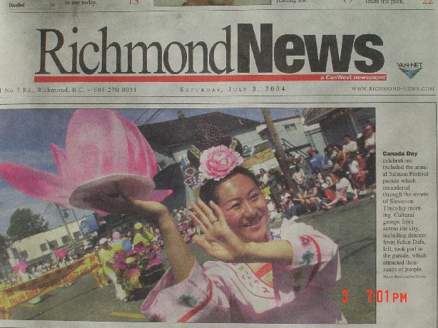 温哥华法轮功学员参加加拿大137届国庆日游行,图为当地报纸的头版图片新闻 加拿大 2004-7-1