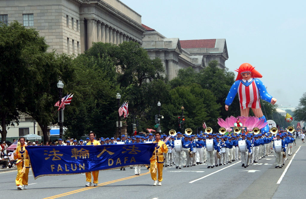 法轮功学员参加美国首都独立日庆祝游行,图为声势浩荡的天国乐团2006-7-4