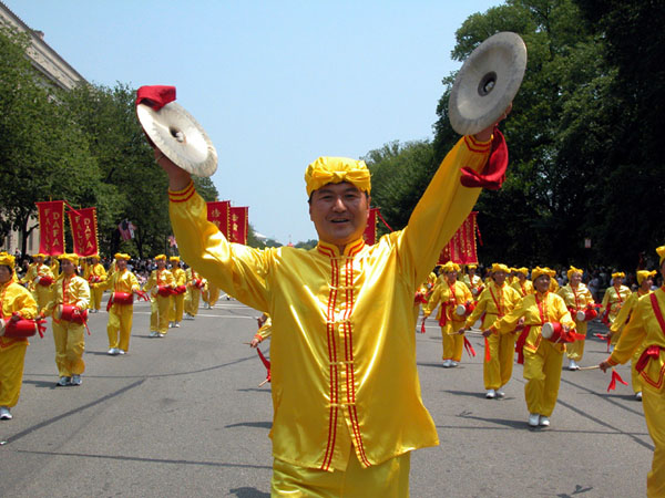 法轮功学员参加美国首都国庆大游行 图为腰鼓队表演腰鼓