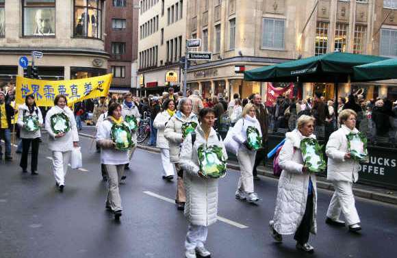 在胡锦涛访问德国期间 法轮功学员举行系列请愿讲真相活动 图为游行队伍2005-11