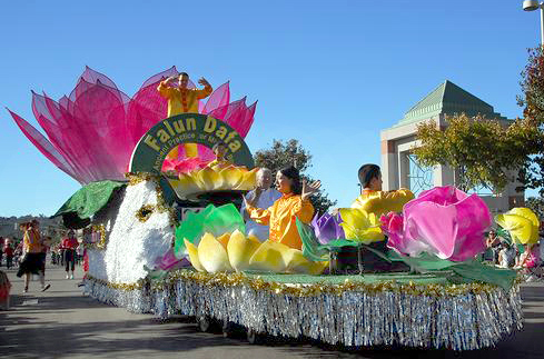 法轮功学员参加圣地亚哥El Cojon市的游行图为精美的莲花花车备受瞩目2006-11-19