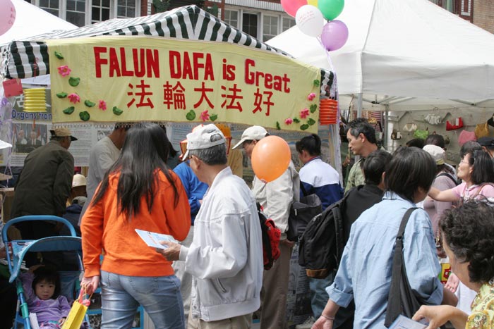 旧金山湾区学员参加唐人街奥克兰中秋街会洪法讲真相揭露迫害 图为民众聚集在法轮功摊位前2006-8-26