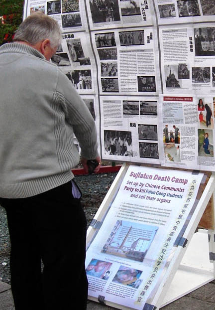 英国学员在中国城揭露中共迫害及播放《九评共产党》纪录片,图为:看真相图片的华人