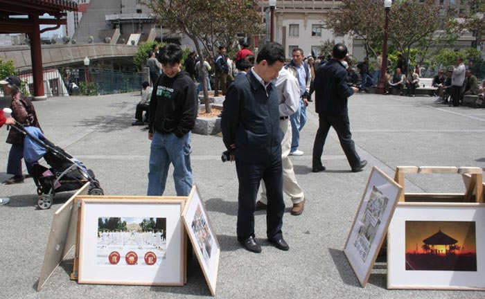 法轮功学员在旧金山湾区中国城花园角广场举办图片展图为民众在观看法轮功真相图片