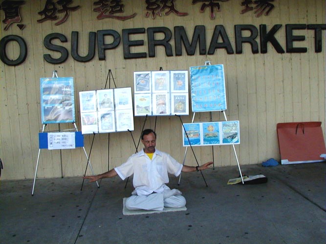 西人法轮功学员杰夫自制展板, 在中国城讲真相 2002-05-19