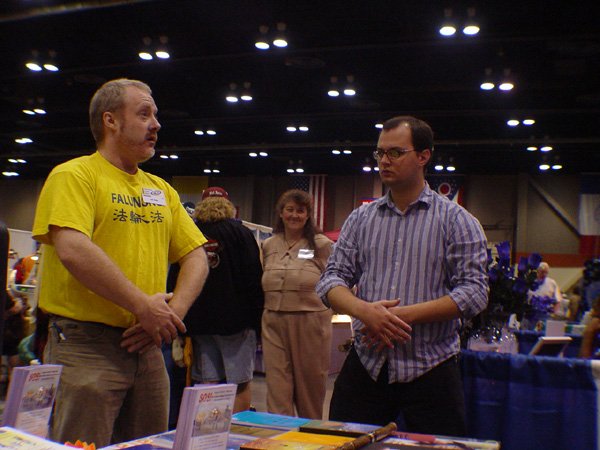 法轮功在2004美国俄亥俄州哥伦布市宇宙之光博览会上受到欢迎,图中一位西人在学习功法 美国 2004-10