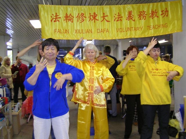 芬兰和拉托维亚法轮功学员在爱沙尼亚塔林的大地节上演示功法受欢迎 爱沙尼亚 2004-10