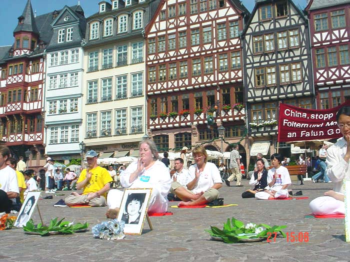 德国法轮功学员在法兰克福著名景点悼念同修, 揭露中共迫害法轮功学员的暴行 2002-08-01