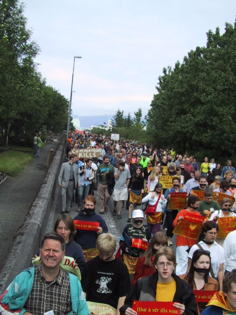 图为6月14日江泽民在冰岛访问期间,当地近三千人游行为法轮功学员受到的不公正对待鸣不平。(Sigourr Hom Gunnarsson)