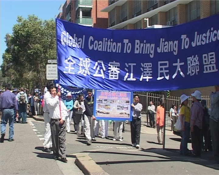 全球审江大联盟在澳洲悉尼中领馆门前举行公众集会和上演模拟公审江泽民仿真剧