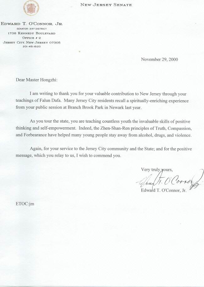 新泽西州参议员至李洪志老师的感谢信