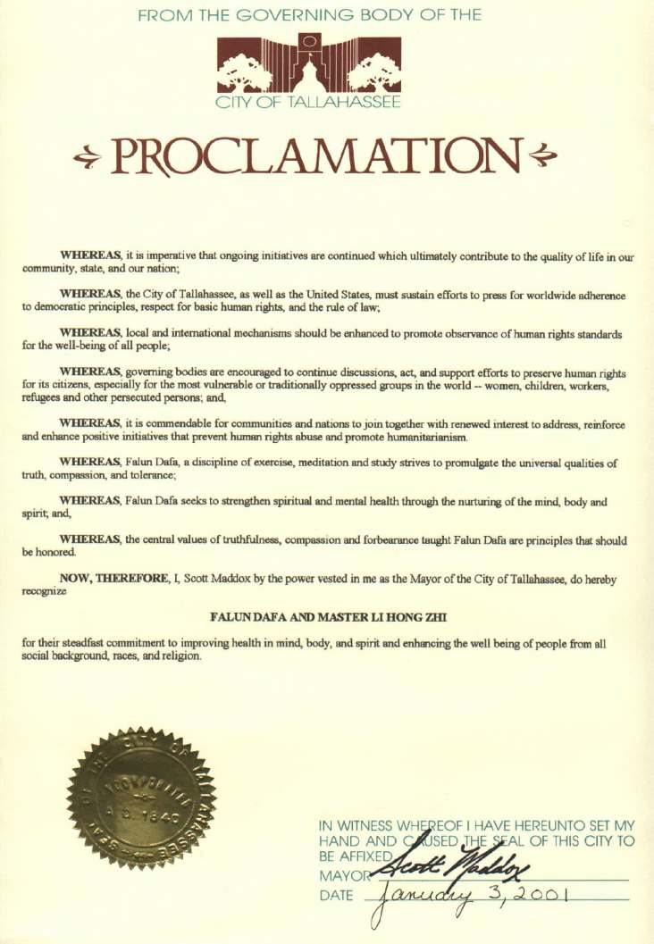 佛罗里达州首府特拉哈西市褒奖法轮大法及其创始人