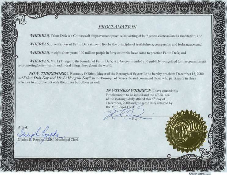 新泽西州赛芮维尔市市长2000年12月6日颁发“法轮大法日和李洪志先生日” 褒奖