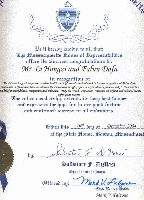 麻省参众两院分别褒奖李洪志先生和法轮大法