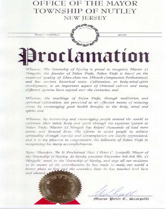 新泽西州纳特立市市长宣布2000年12月4—8日为“李洪志先生周”