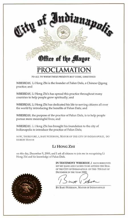 印第安那州印第安那普利斯市市长2000年12月9日褒奖李洪志老师