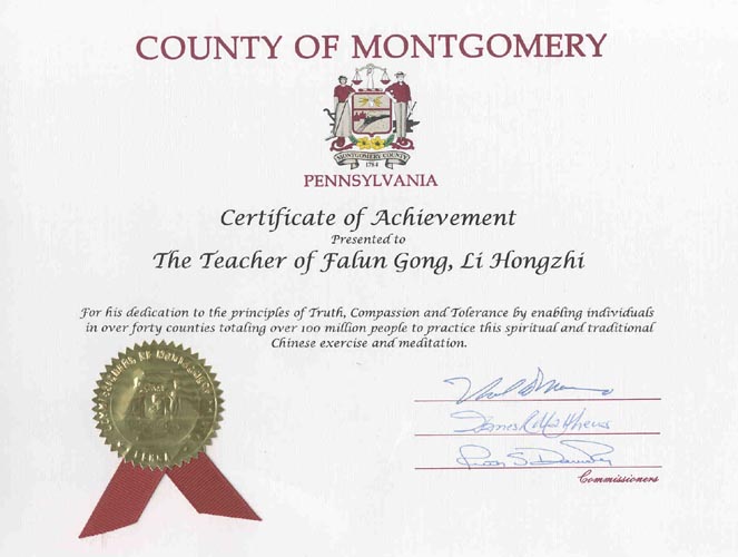 宾州蒙特苟马力郡(montgomery)授予李洪志老师荣誉证书以褒奖李洪志老师致力于“真善忍”的传播