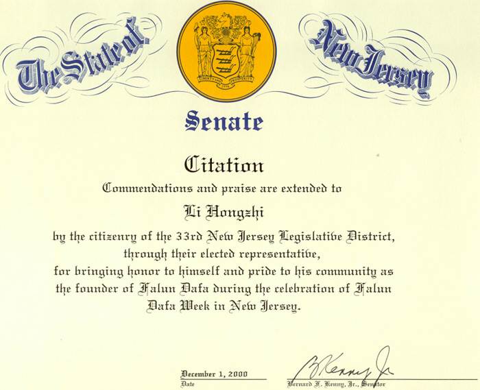 新泽西州33选区参议员2000年12月1日为李洪志老师颁发的嘉奖令