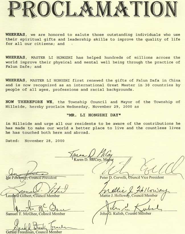 新泽西州希尔赛德市市长和七名议员联合宣布2000年11月9日为“李洪志先生日”