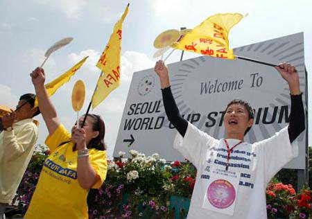 美联社图片:法轮功学员在汉城世界杯赛上抗议江泽民在中国迫害法轮功