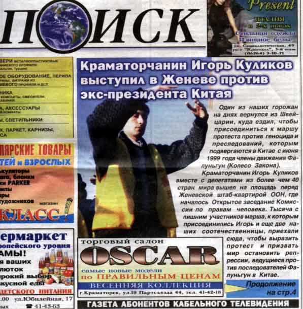 乌克兰“探索报”:克拉马托尔斯克居民伊戈里-库利科夫在日内瓦参加反对前中国国家主席的抗议活动