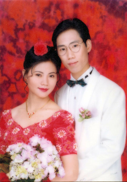 饶卓元(广州),广州市卫生防疫站食品监督员,因修炼法轮功多次被劳教、关精神病院,于2002年8月5日被迫害致死,年仅34岁,图为与妻子的婚纱照