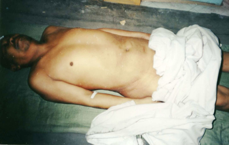 赵英奇(唐山,伤残人) 于2002年12月30日被唐山市荷花坑劳教所折磨致死,终年59岁。图为伤痕累累的遗体