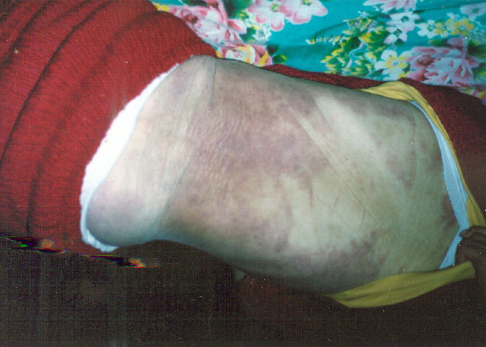 杨海玲(黑龙江)于2003年4月12日被黑龙江省密山第一看守所迫害致死。年仅35岁 图为遗体上伤痕累累